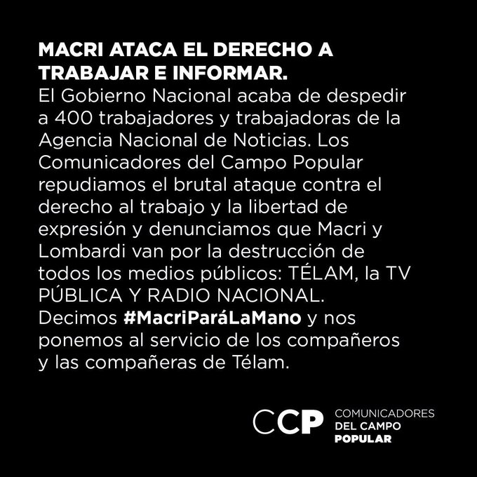 #Telam | Argentina's national #NewsAgency, created in 1945 – has #dismissed 354 employees, almost 40 percent of its total personnel. Article by @camilstras https://t.co/NnNZ9YZdbJ
